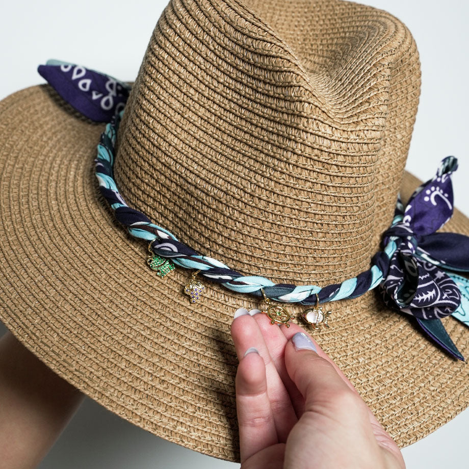 Our Paisley Bandana straw hats are crafted for comfort and style—lightweight and breathable to keep you cool under the sun. Each hat features soft bandana ties and delicate metal charms for an added touch of personality. Perfect for beach days, festivals, or everyday wear, these hats offer shade with a relaxed, boho feel.
